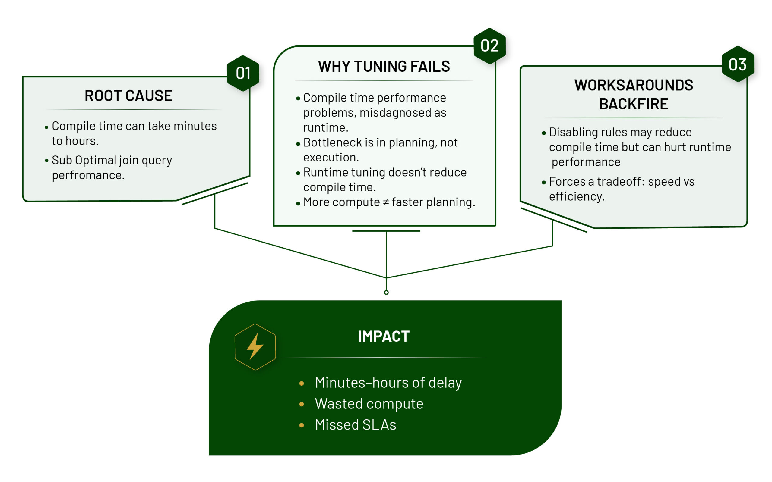 The following issues are associated with excessive compilation time, inefficient optimization behavior, or suboptimal runtime execution, especially in large or complex query plans: